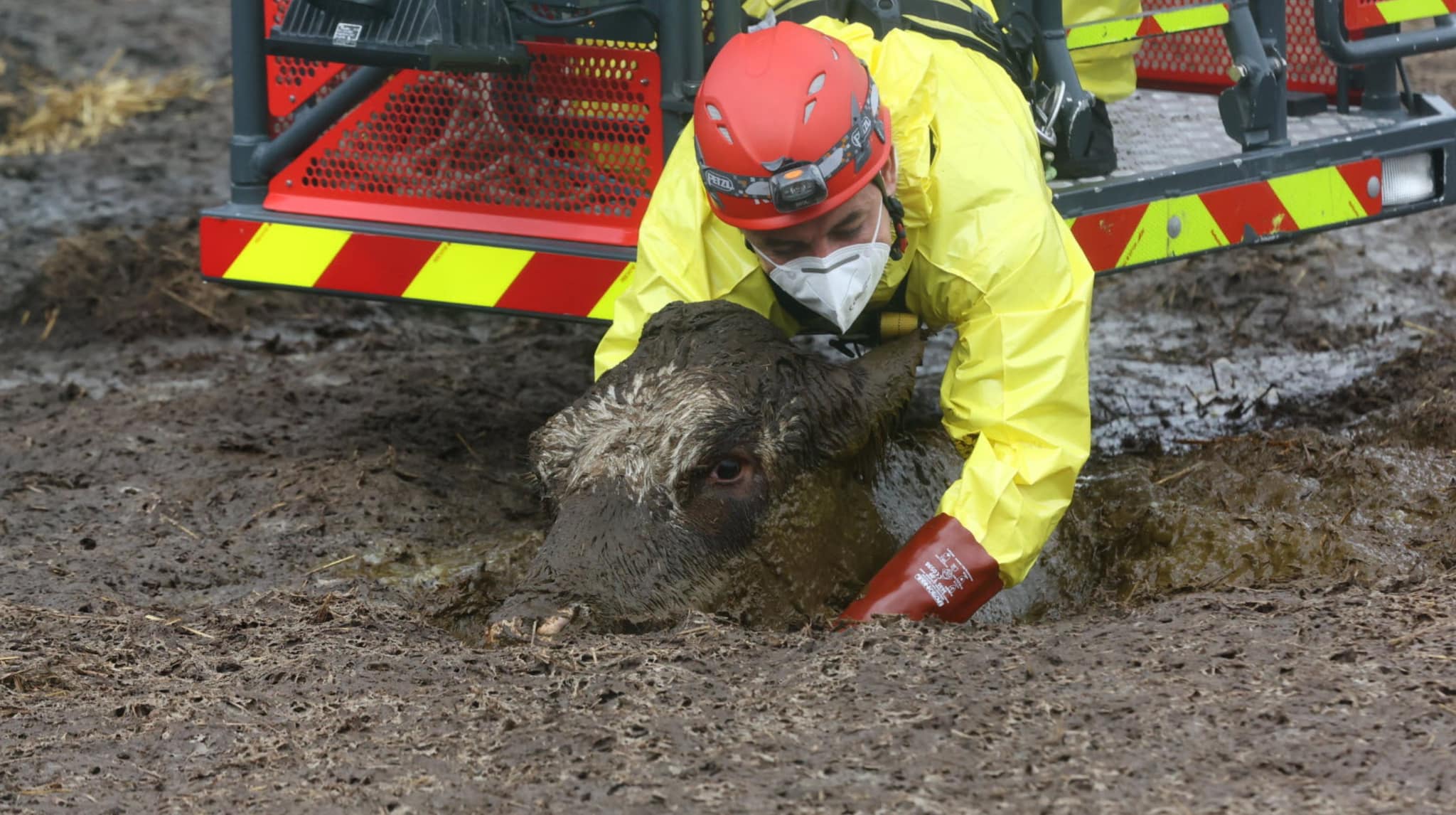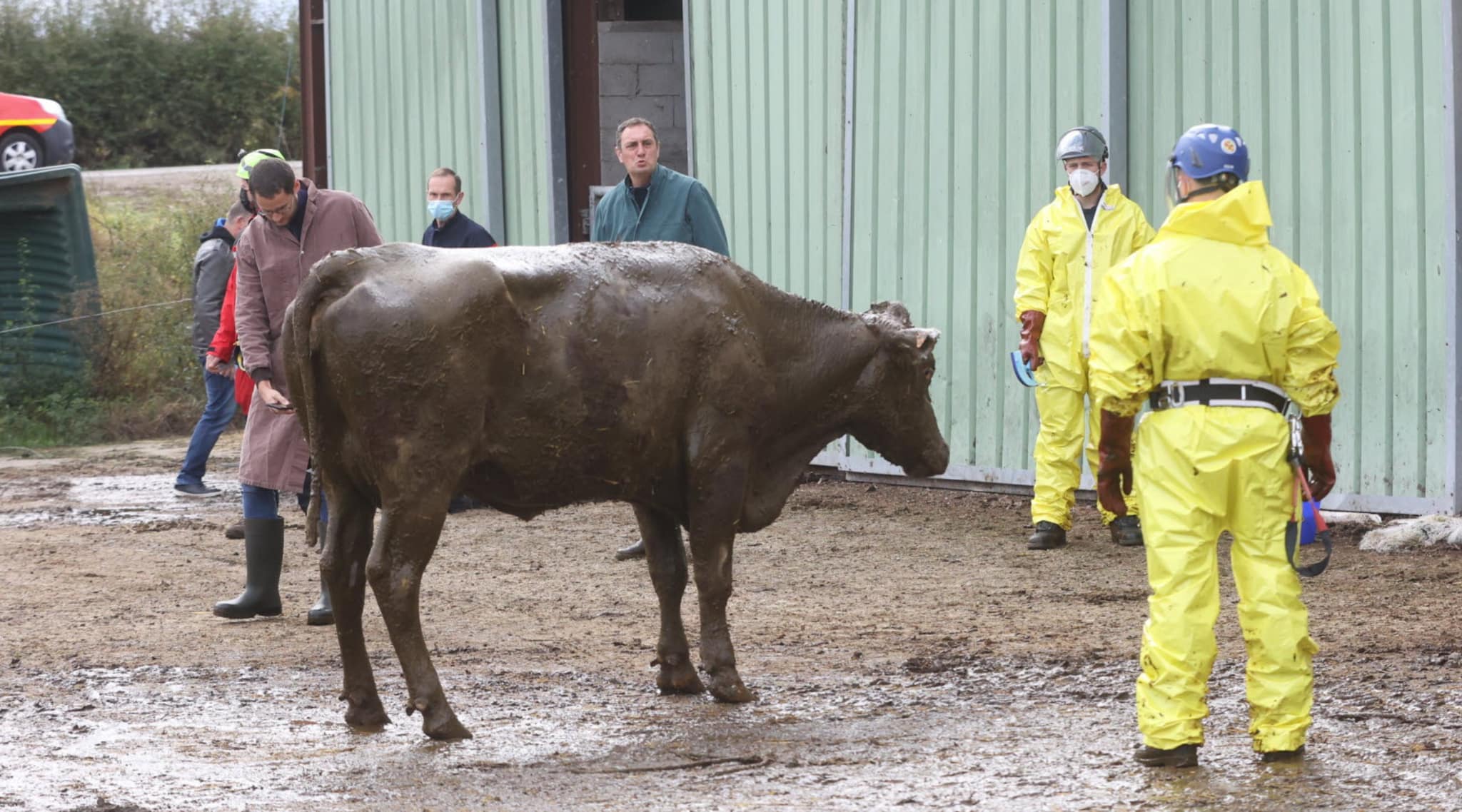 Avec l’aide de la grande échelle, des équipes de sauveteurs animaliers, de plongeurs et de Secours en Milieux Périlleux et de Montagne (SMPM), ils ont réussi à hisser le bovin hors de la fosse.